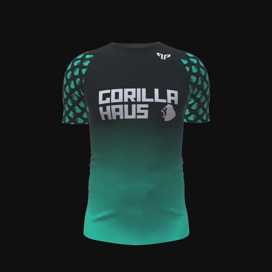 - 1 x Gradient Training T-Shirt – your chosen colour blending seamlessly into black, with the Gorilla Haus logo and wordmark in white across the chest, colour-coded mini Gorilla icons patterned across both sleeves to match the top, and GORILLA HAUS MIXED MARTIAL ARTS running vertically down the back in white.