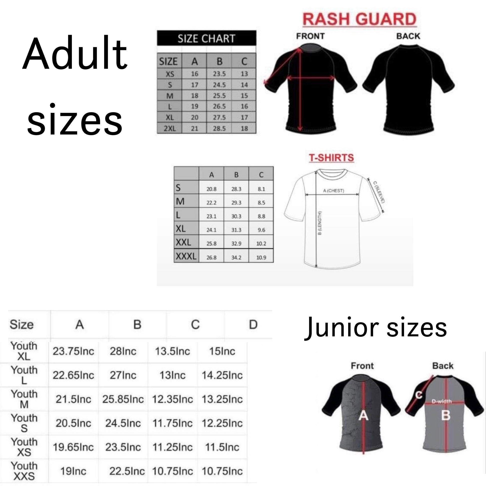 Junior sizes can run smaller as the chart shown is typically for rash guards. Recommended to buy a size up (especially as the juniors are still growing too!)
